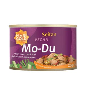 A 225g tin of classic Mo-Du (Mock Duck), a popular canned plant-based meat alternative made from wheat gluten, submerged in a rich, savoury sauce. It has a dense, fibrous texture and a sweet-salty flavour, commonly used in Asian cuisine, curries, stir-fries, or served over rice.