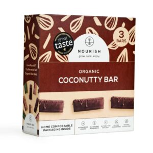 Nourish Coconutty Bar – A richly‑flavored, wholesome snack bar combining a base of cacao macaroons with roasted almond butter, all coated in thick raw cacao.