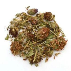 The dried pink/red flowers of the red clover plant, traditionally used to brew a mild, slightly sweet tea valued for its phytoestrogen content.