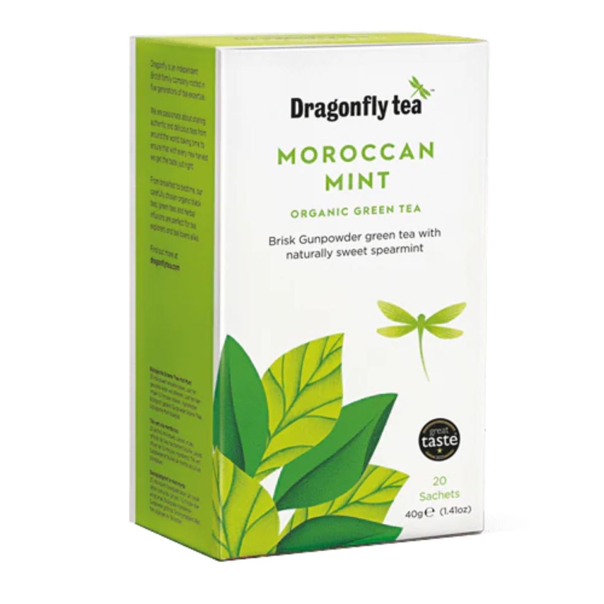A box of 20 organic tea bags featuring a vibrant, refreshing blend of green tea and highly aromatic spearmint. Inspired by the traditional Maghrebi tea ceremony, this blend offers a perfect balance of invigorating green tea bitterness and the intensely cool, sweet taste of fresh mint, excellent served hot or iced.