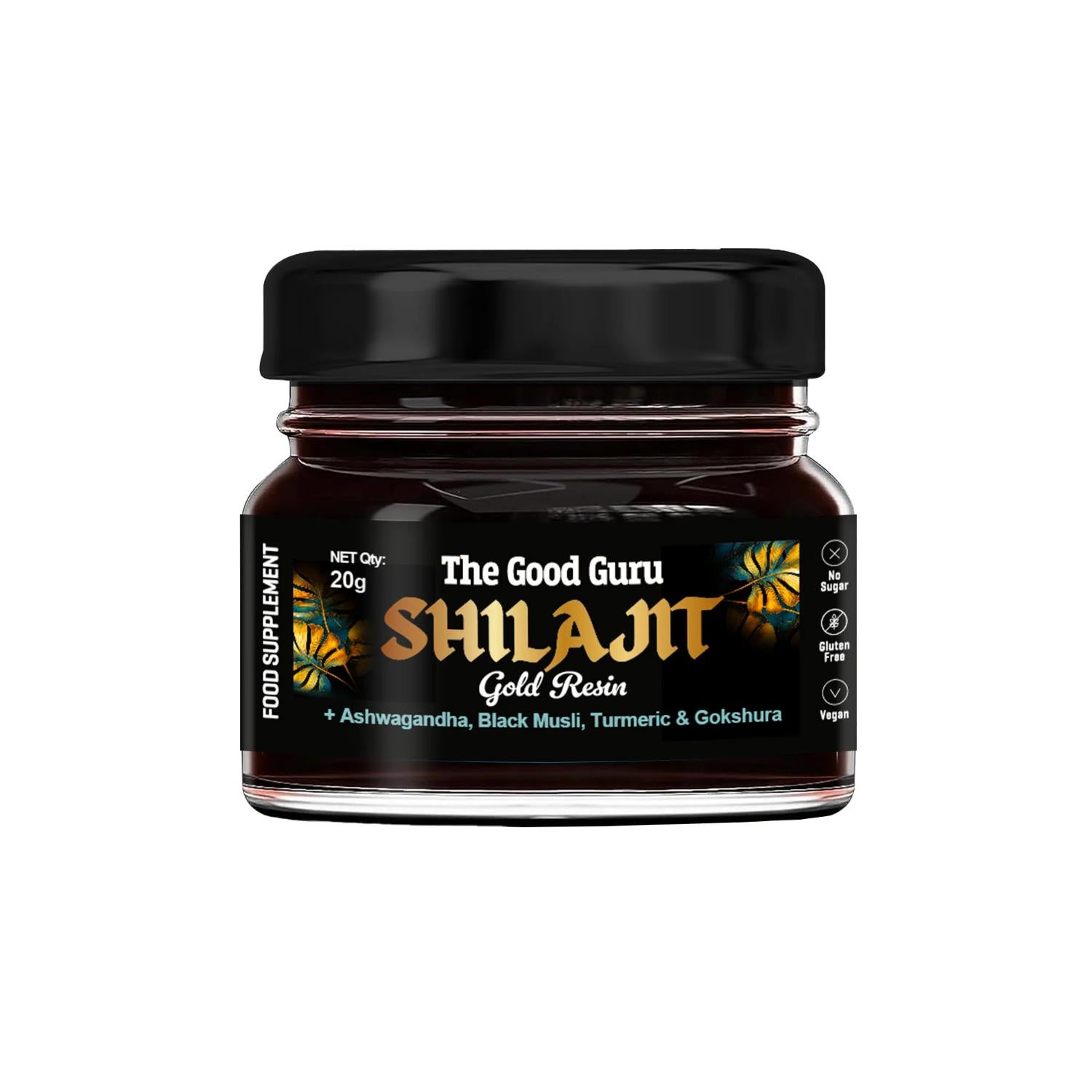 A 20g jar of ultra-premium, purified Shilajit resin, often combined with trace amounts of Gold Bhasma. This product is considered a superior formulation for comprehensive energy, immune, and mental support.