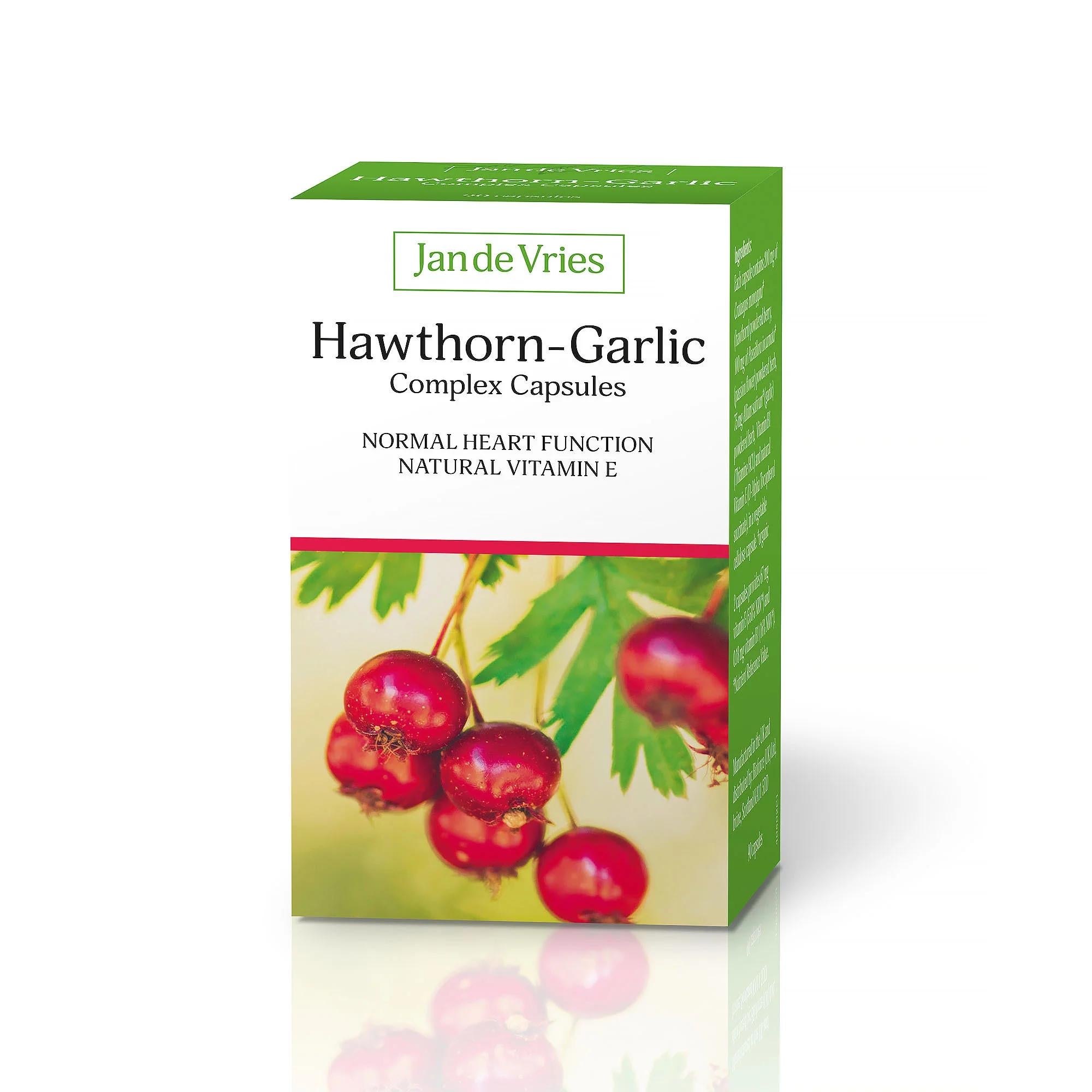 Jan de Vries Hawthorn-Garlic Complex (90 Capsules) – A vegan-friendly supplement combining organically-cultivated garlic (Allium sativum), hawthorn berry (Crataegus monogyna) and passion flower (Passiflora incarnata), enriched with vitamin B1 (thiamine) and natural vitamin E to support normal heart function, circulation and antioxidant protection of cells.