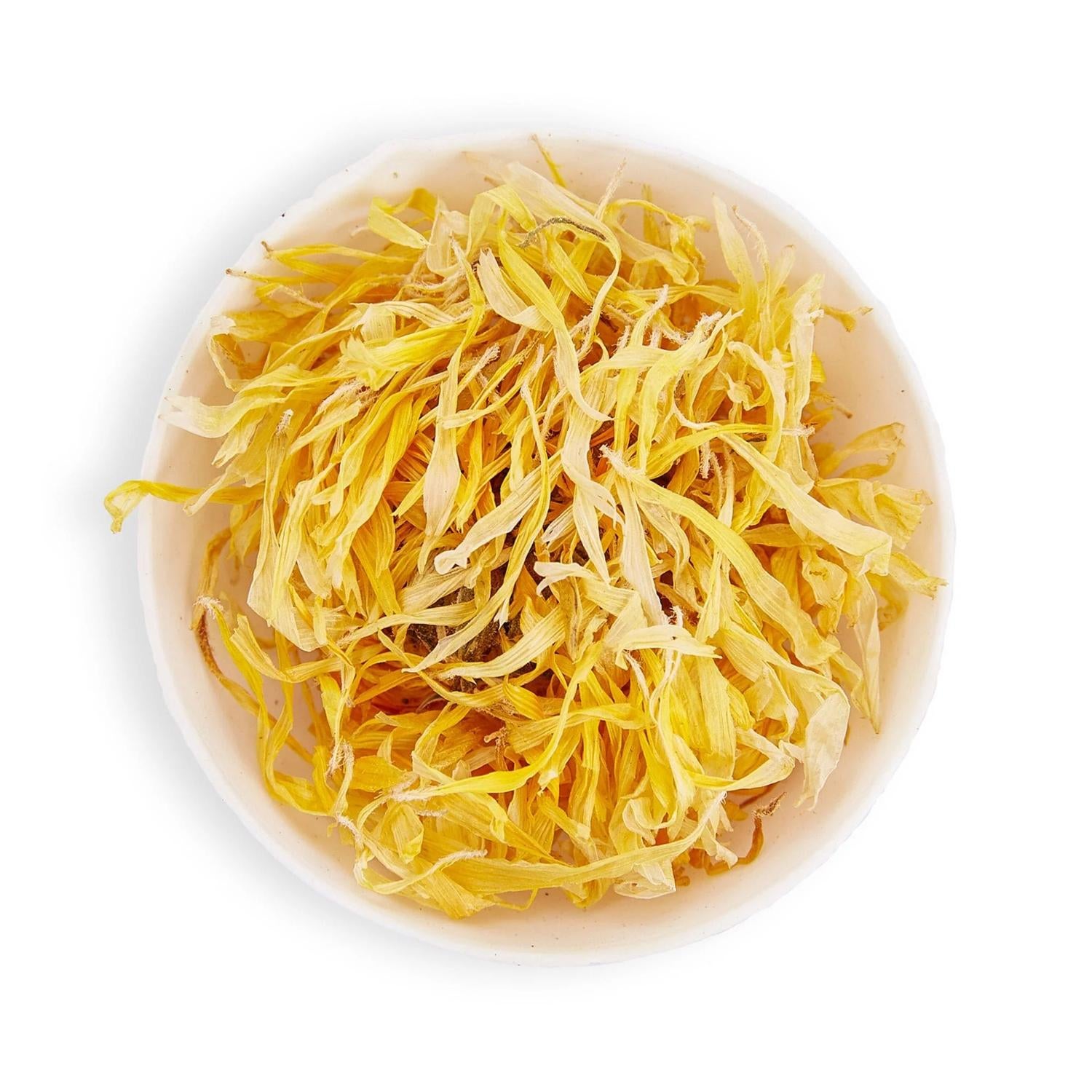 Vibrant, dried organic calendula petals, used in herbal teas and often incorporated into homemade oils, salves, and washes for their traditional skin-soothing properties.