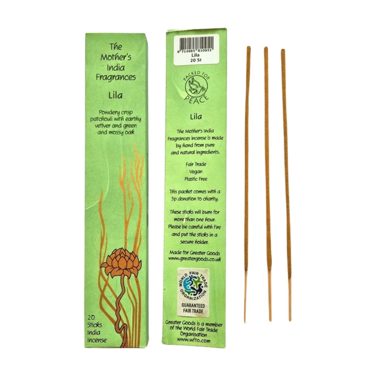 A pack of 20, 8-inch long incense sticks featuring the delicate, playful, and joyful scent ‘Lila’, representing the divine cosmic play. This fragrance is light, sweet, and uplifting, perfect for everyday enjoyment and mood enhancement.