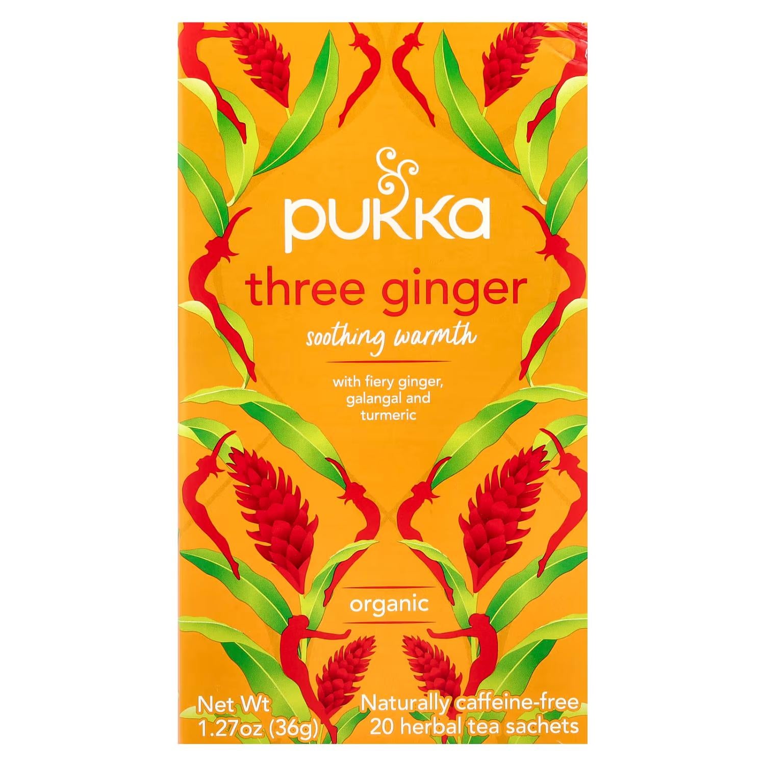 A box of 20 organic tea bags featuring a powerful, warming infusion that combines three different types of ginger (e.g., galangal, fresh ginger, dried ginger). This blend is intensely warming, excellent for digestion and fighting chills.