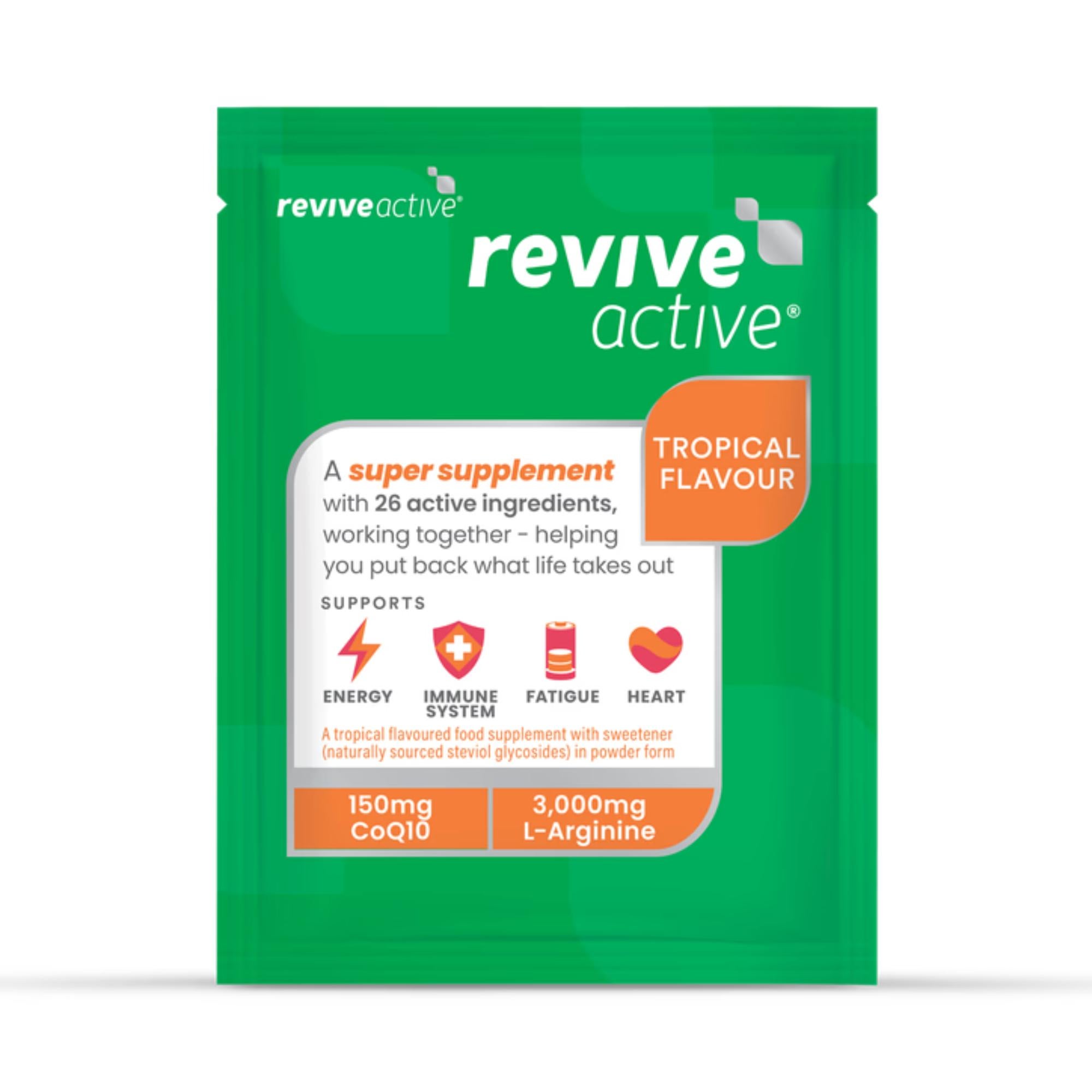 Revive Active Multivitamin Powder – 30 Sachets – A comprehensive “super-supplement” formula combining 26 active ingredients including vitamins, minerals, amino acids (like L-arginine, citrulline, taurine) and 150 mg CoQ10 per sachet, designed to support energy, immunity, cardiovascular health and overall wellness.