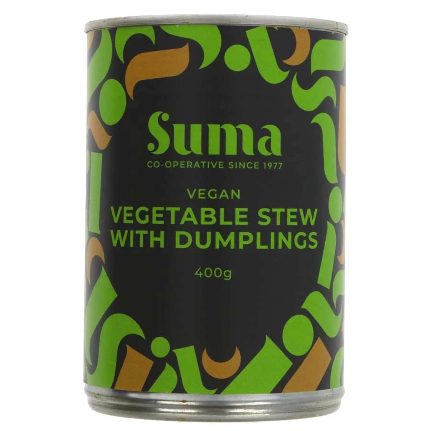 A convenient can of organic, hearty vegetable stew, featuring plant-based dumplings swimming in a rich, thick, savoury gravy and packed with root vegetables. This is a substantial, ready-made vegan meal designed for warmth and comfort.