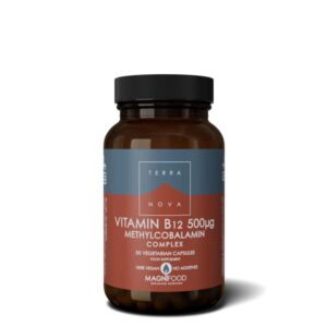 A bottle of 50 capsules, each providing 500mg of Vitamin B12, crucial for energy, nerve health, and red blood cell formation. This formula is often supported by the Magnifood complex for enhanced efficacy.