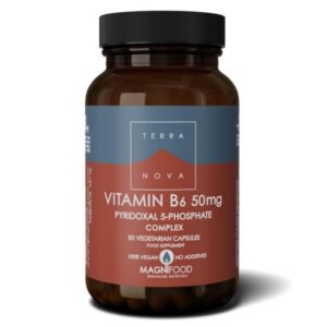 A bottle of 50 capsules, each providing 50mg of Vitamin B6 (Pyridoxine), essential for protein metabolism, brain health, and hormone regulation.
