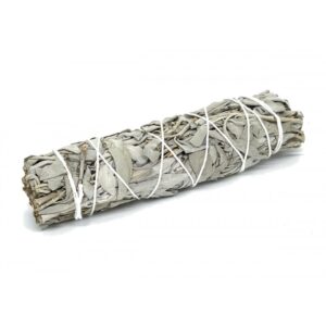 A bundled stick of dried White Sage (Salvia apiana), traditionally burned to cleanse and purify spaces and individuals. When lit, it releases a potent, highly aromatic smoke used for smudging and ceremonial purposes.