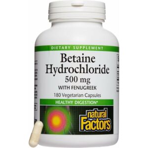 A bottle of capsules, each containing 500mg of Betaine Hydrochloride (Betaine HCl). This supplement is primarily taken to support healthy digestion by temporarily increasing the concentration of hydrochloric acid in the stomach, which can aid in the breakdown and absorption of nutrients.
